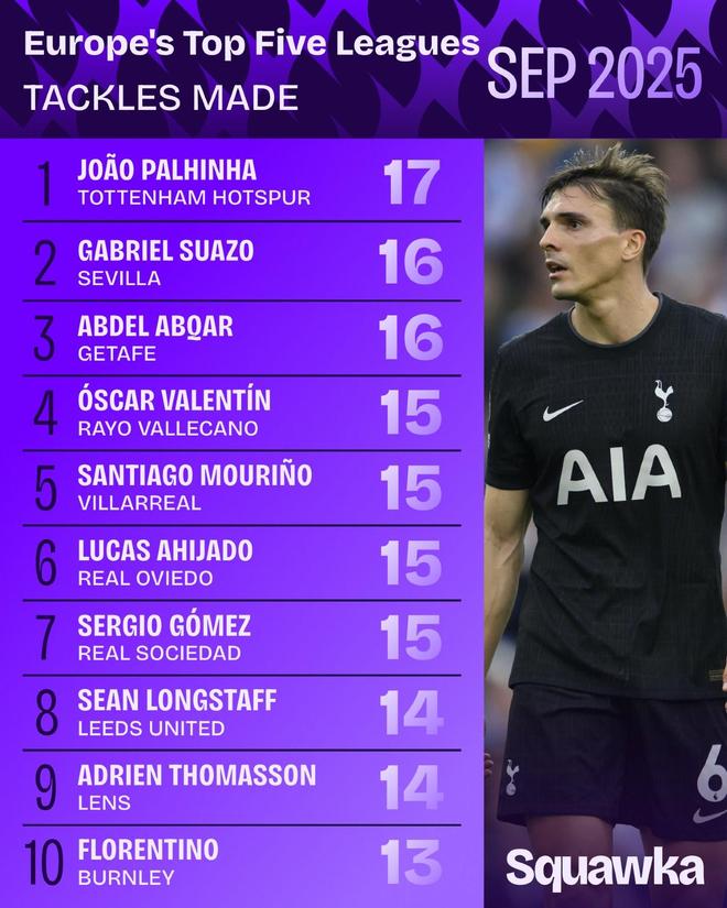 當地時間10月1日,知名數據機構Squawka發布了五大聯賽九月份鏟球榜,熱刺中場帕利尼亞以17次鏟球位居榜首。